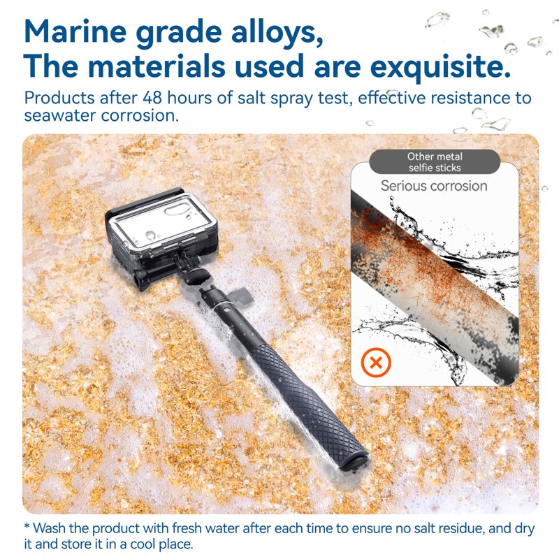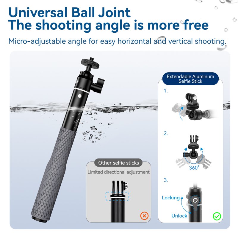 TELESIN WSS-001 är en mångsidig och hållbar selfie-stick med gimbal. Den är perfekt för både horisontella och vertikala bilder. Med sin vattentåliga design kan du använda den under vatten och nära vattenytor. Den är lätt att transportera och ger stabila bilder i alla miljöer.