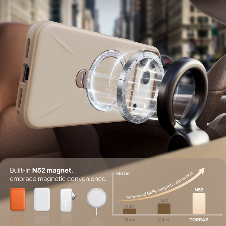 Med inbyggda magneter som är perfekt anpassade för MagSafe, kan du ladda trådlöst och använda magnetiska tillbehör snabbt och smidigt utan att ta av skalet. Det smarta 360° roterbara gångjärnsstativet gör det dessutom enkelt att ställa upp mobilen i valfri vinkel – perfekt för videosamtal, filmvisning eller arbete på språng.