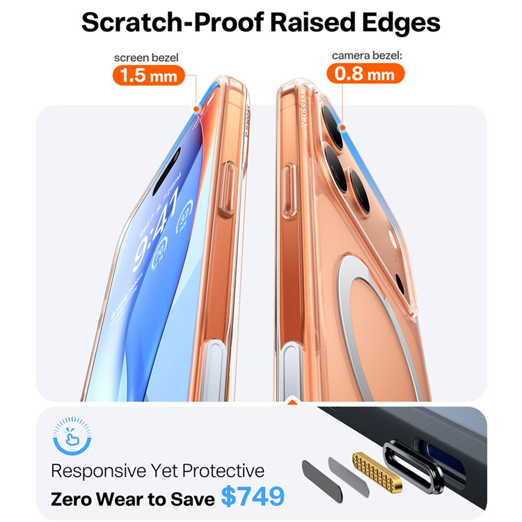 Förhöjda kanter – 1,5 mm runt skärmen och 1,2 mm runt kameran för att förhindra repor och skador vid stötar.