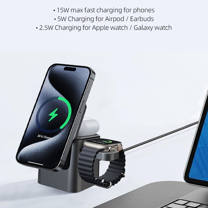 - Trådlös laddning för flera enheter - Ladda telefon, AirPods och smartklocka samtidigt.