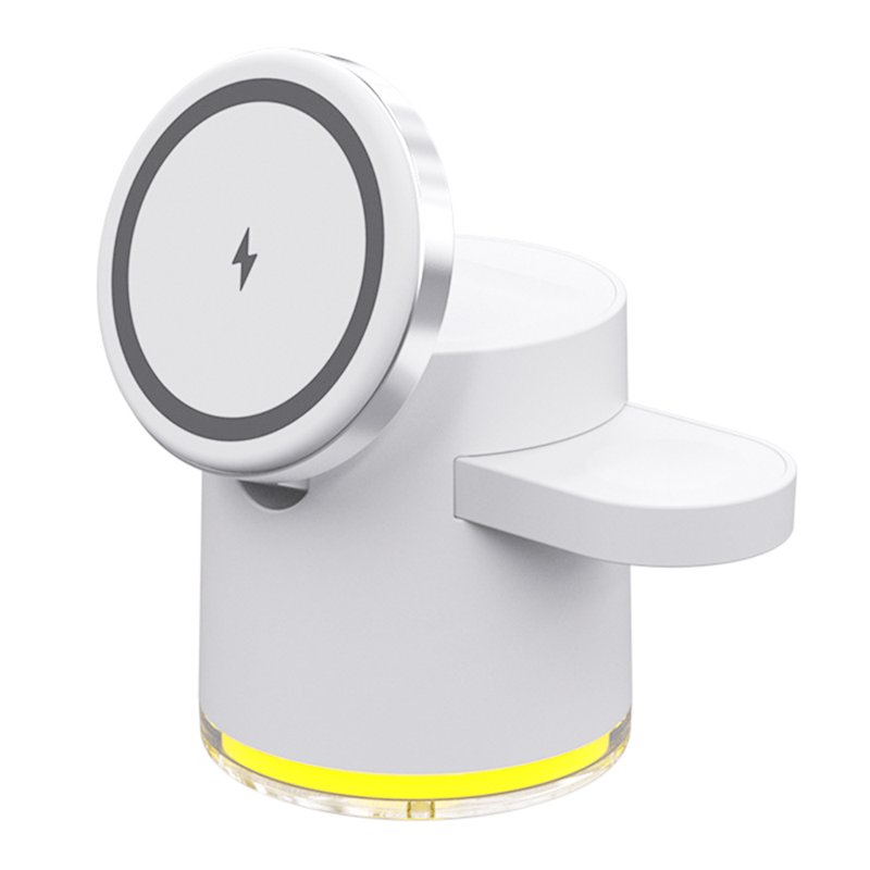 Denna trådlösa laddare är perfekt för iPhone, Apple Watch, Samsung Watch och Airpods. Med en kraftfull magnet håller den din enhet på plats. Den fungerar även som en praktisk ställning för att visa din klocka och telefon. Dessutom har den en nattlampa för extra bekvämlighet.