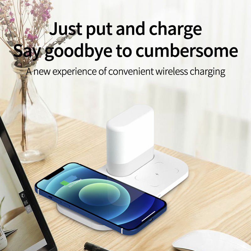 Upplev en ny nivå av bekvämlighet med vår trådlösa laddningsstation. Den är designad för att enkelt ladda både mobiltelefoner och hörlurar. Med en nattlampa som ger ett mjukt och behagligt ljus, är denna laddningsstation perfekt för både hemmet och resan.