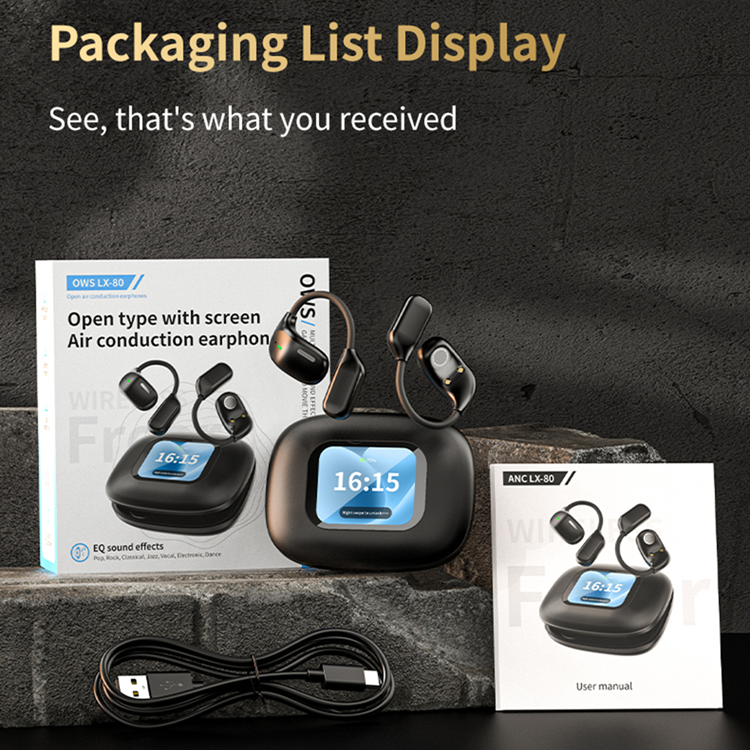 Trådlösa Bluetooth-Hörlurar Noise Cancellation Sports Ear-hook med Pekskärm i fullfärg Laddningsfodral LX-80 - Svart