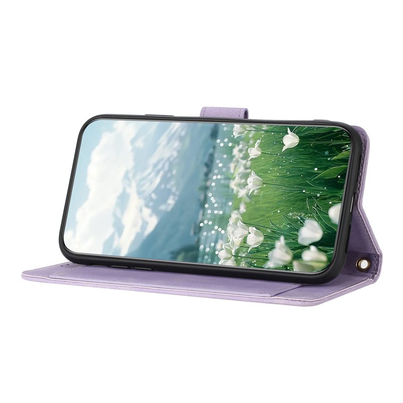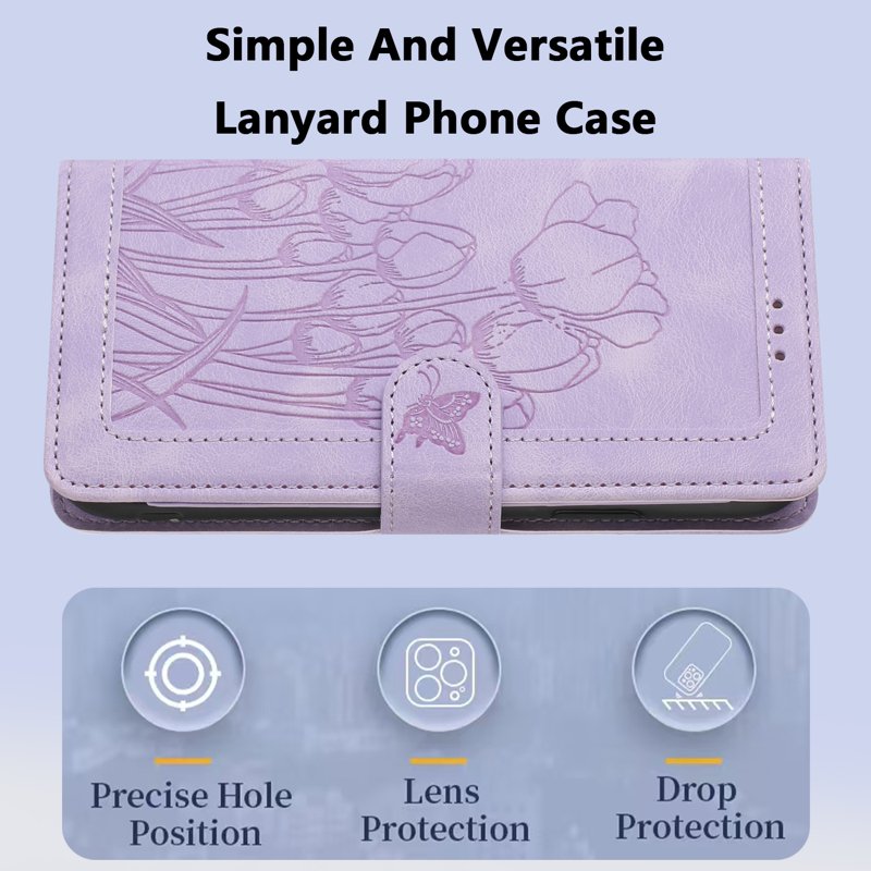 Detta mobilfodral kombinerar stil och funktionalitet. Med plats för kort och kontanter håller det dina viktigaste tillhörigheter organiserade. Det är tillverkat av slitstarkt PU-läder och TPU, vilket ger utmärkt skydd mot stötar. Fodralet har även en inbyggd ställfunktion för bekväm visning av videor. Det eleganta tulpanmönstret ger en sofistikerad touch.