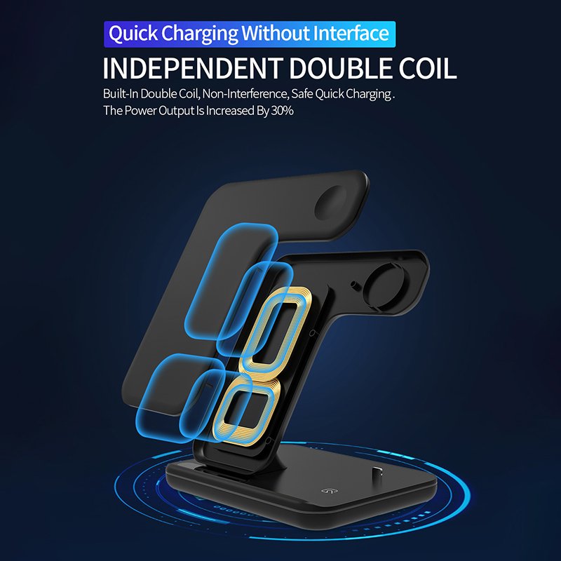 Denna 3-i-1 trådlösa laddare är perfekt för att ladda din mobiltelefon, Apple Watch och AirPods samtidigt. Med smarta funktioner och säkerhetsåtgärder erbjuder den en effektiv och bekväm laddningslösning för alla dina enheter. Njut av snabb och säker laddning utan krångel.