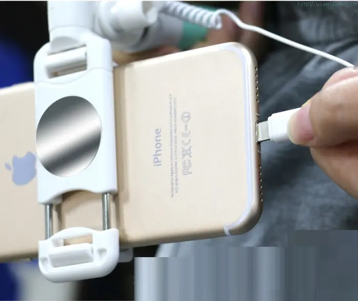 Hållaren är dessutom utrustad med en praktisk konvex spegel för att ersätta telefonens display. Tack vare det behöver du inte använda den främre kameran utan kan använda huvudkameran och på så sätt få bättre bilder. Selfie sticken kopplas till din iPhone med den medföljande lightning-kontakten.