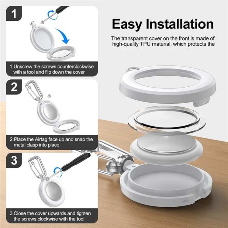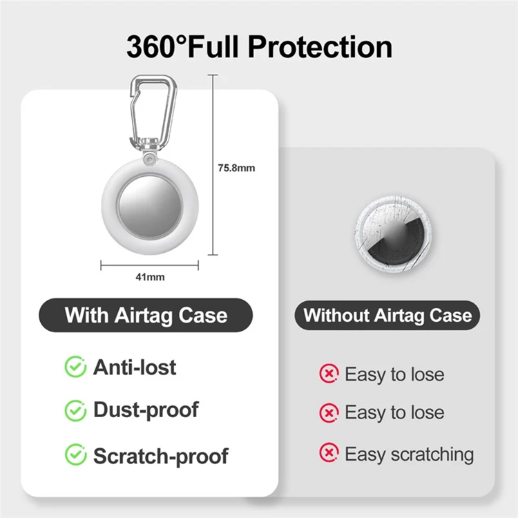 Tillverkat i robust PC-material som tål vardagens utmaningar. Den tätslutande konstruktionen håller fukt och smuts ute, medan den medföljande kroken gör det enkelt att fästa AirTagen på precis det du vill spåra. Trots sin tåliga design behåller du full tillgång till enhetens funktioner – inga krångel, bara pålitligt skydd.