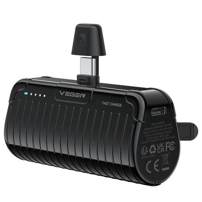 VEGER Powerbank 5000 mAh 20W Kontakt PlugIn USB-C PD QC 3A - Svart