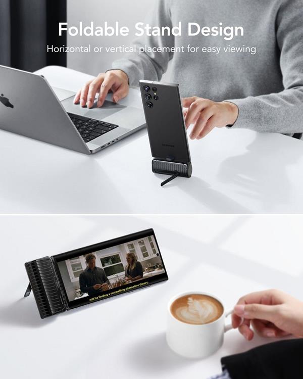 Powerbanken är utrustad med ett vikbart ställ som håller din smartphone både vertikalt och horisontellt i en 68-gradig vinkel, vilket gör att du enkelt kan använda din telefon under tiden den laddas.
