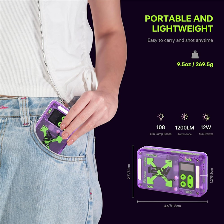 Upplev professionell belysning i ett kompakt och mångsidigt format med VILTROX RB-V12, utrustad med 108 högkvalitativa LED-pärlor (CRI 97+) för naturtrogen färgåtergivning. Den erbjuder 360° RGB-färg, justerbar färgtemperatur från 3000–5600K och ett kraftfullt ljusflöde på 810 Lux vid 0,7 meter, vilket gör den idealisk för vloggar, porträtt, produktfoto, YouTube/TikTok-innehåll, selfies och kreativa inspelningsmiljöer.