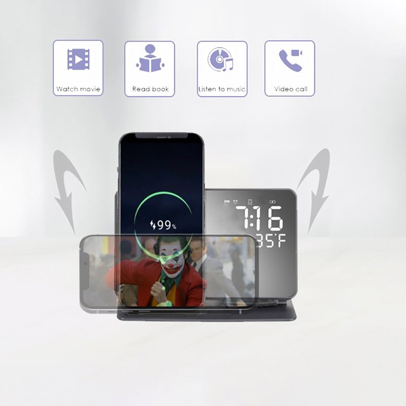 Denna 2-i-1 designade klocka är perfekt för dig som vill ladda din telefon medan du sover. Med en stor skärm som även fungerar som sminkspegel när den är avstängd, är denna klocka både praktisk och stilren. Den digitala LED-klockan visar tid och temperatur samt har en alarmfunktion.