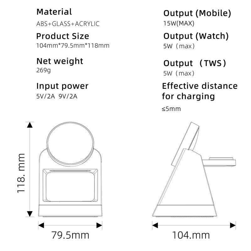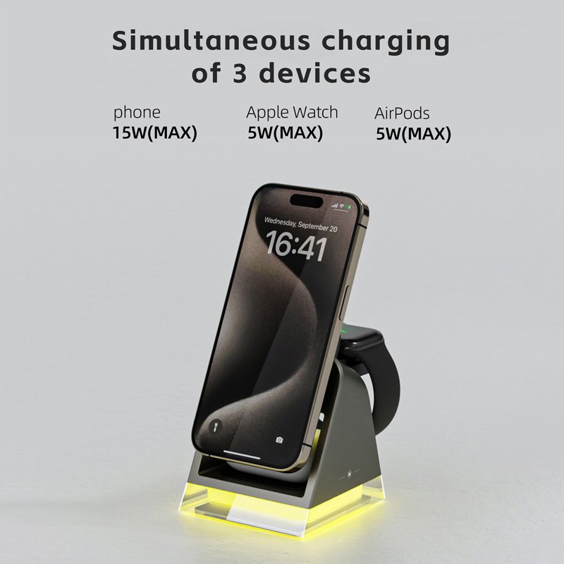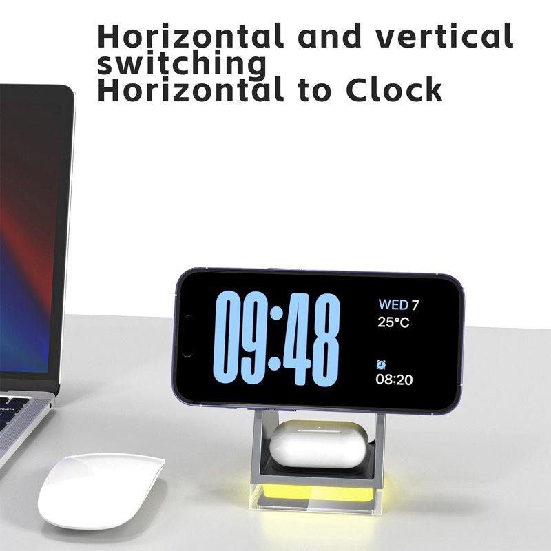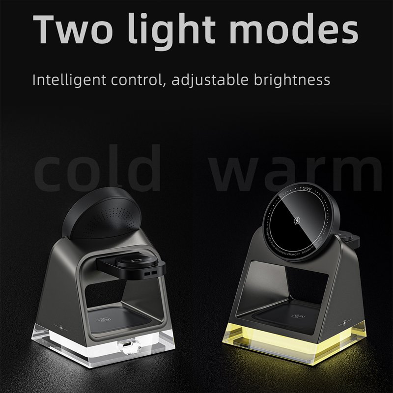 Denna 3-i-1 magnetiska trådlösa laddare är perfekt för att ladda din smartphone, smartwatch och TWS hörlurar samtidigt. Med en inbyggd kristallnattlampa och justerbar ljusstyrka erbjuder den mångsidiga belysningsalternativ för alla behov. Kompakt och lätt, den är idealisk för både hemmet och resor.