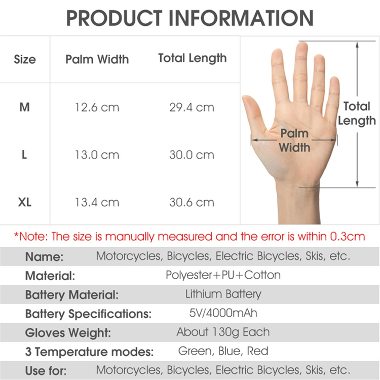 Slipp kalla händer i vinter! Dessa uppvärmda handskar är designade för att hålla dig varm, torr och bekväm även under de kallaste dagarna. Med tre justerbara värmelägen kan du enkelt välja den temperatur som passar bäst för din aktivitet – oavsett om du åker skidor, cyklar, arbetar utomhus eller promenerar i snö och kyla.