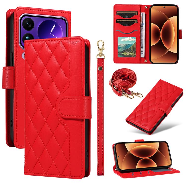 Xiaomi 17 Pro Max Plånboksfodral Rhombus Läder Med Rem - Röd