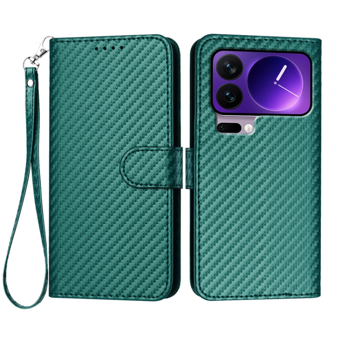 Xiaomi 17 Pro Plånboksfodral Carbon Fiber Texture Läder med Rem - Svartgrön