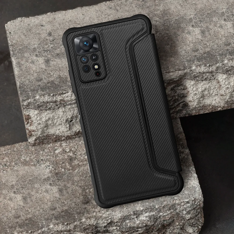 Razor-hölstrets kol-fiberinspirerade yttre, i en mörk nyans, ger en sofistikerad och sportig känsla som påminner om designen hos lyxiga sportbilar. Insidan är klädd i mjuk mikrofiber som skyddar skärmen från skador, medan det inre honungsmönstret i gummi inte bara förbättrar estetiken utan också ger extra stöd för din telefon.