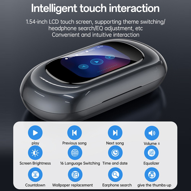 LCD-display med smarta funktioner: Visa batterinivå, byt tema, justera EQ och hitta hörlurarna snabbt.