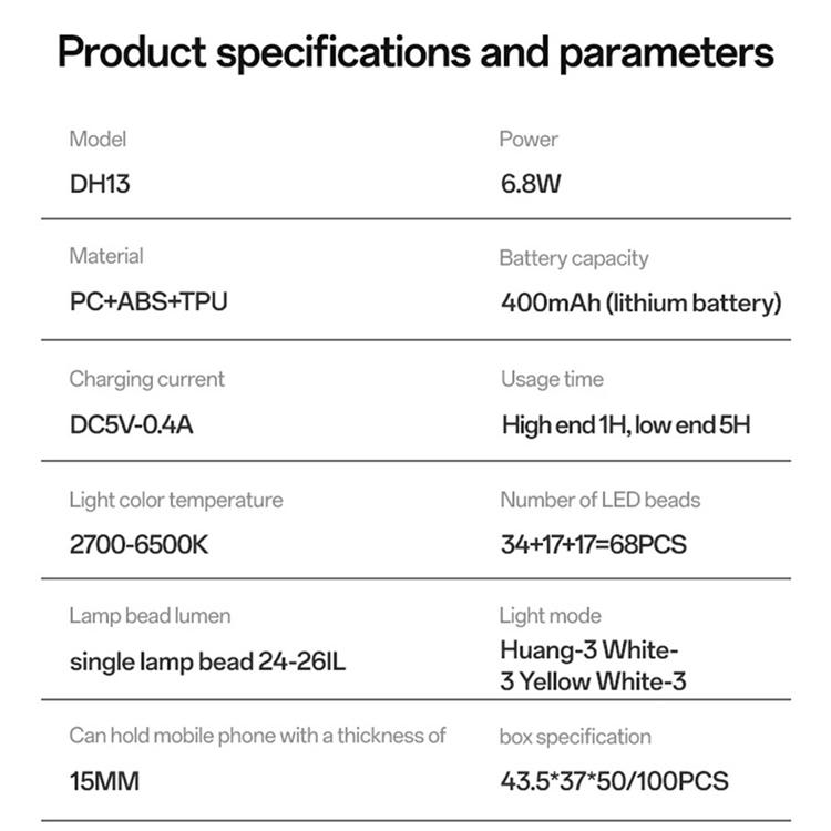 Ljuslägena – varmt, kallt och mixat – kan anpassas i tre nivåer vardera, vilket ger dig totalt nio olika ljusinställningar. Den inbyggda 400mAh litiumbatteriet räcker upp till 5 timmar på lägsta läget, vilket gör lampan perfekt för långa sessioner eller användning på resande fot. Med en justerbar klämma passar den de flesta smartphones och surfplattor upp till 15 mm i tjocklek.