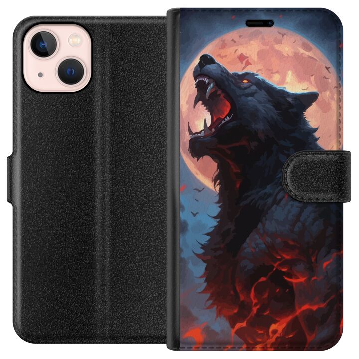 Plånboksfodral för iPhone 13 med Ylande varg -design. Fodralet kombinerar stil och funktion – ett slitstarkt mobilskal som skyddar mot repor och stötar samt praktiska kortfack på insidan.