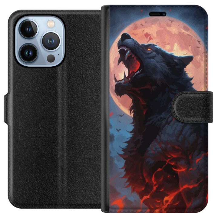 Plånboksfodral för iPhone 13 Pro med Ylande varg -design. Fodralet kombinerar stil och funktion – ett slitstarkt mobilskal som skyddar mot repor och stötar samt praktiska kortfack på insidan.